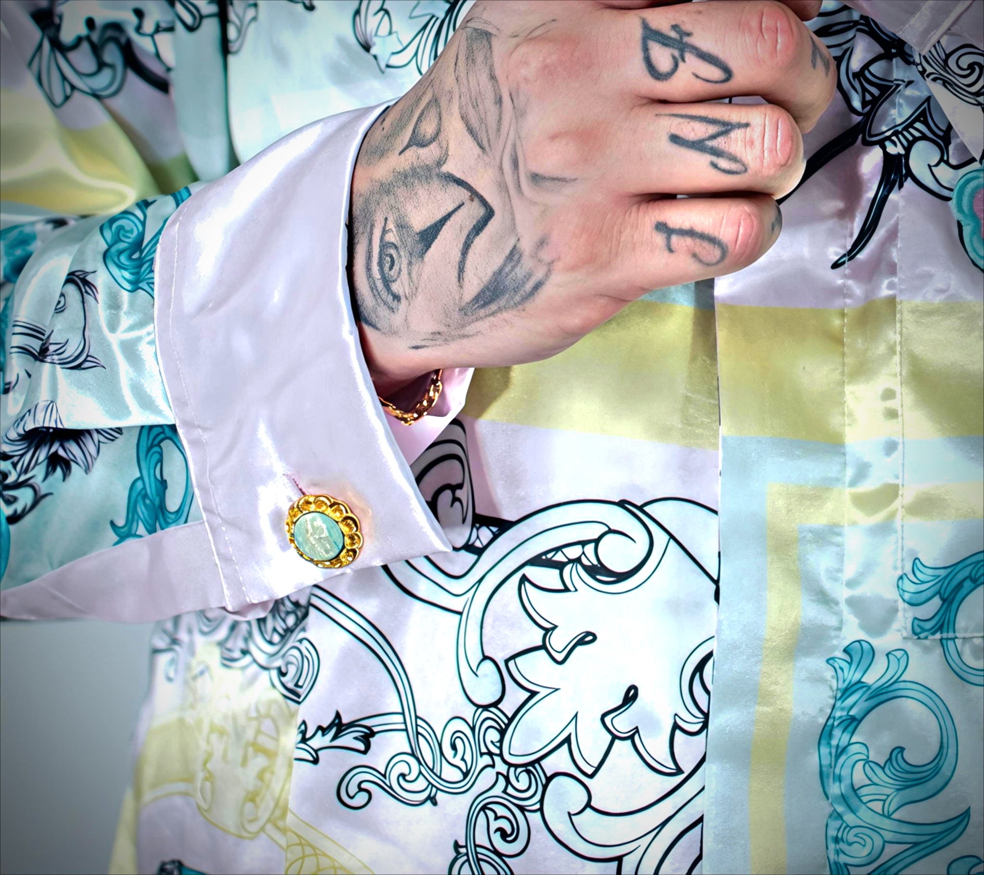 - Botón en puño; piedra color aqua con dorado.
