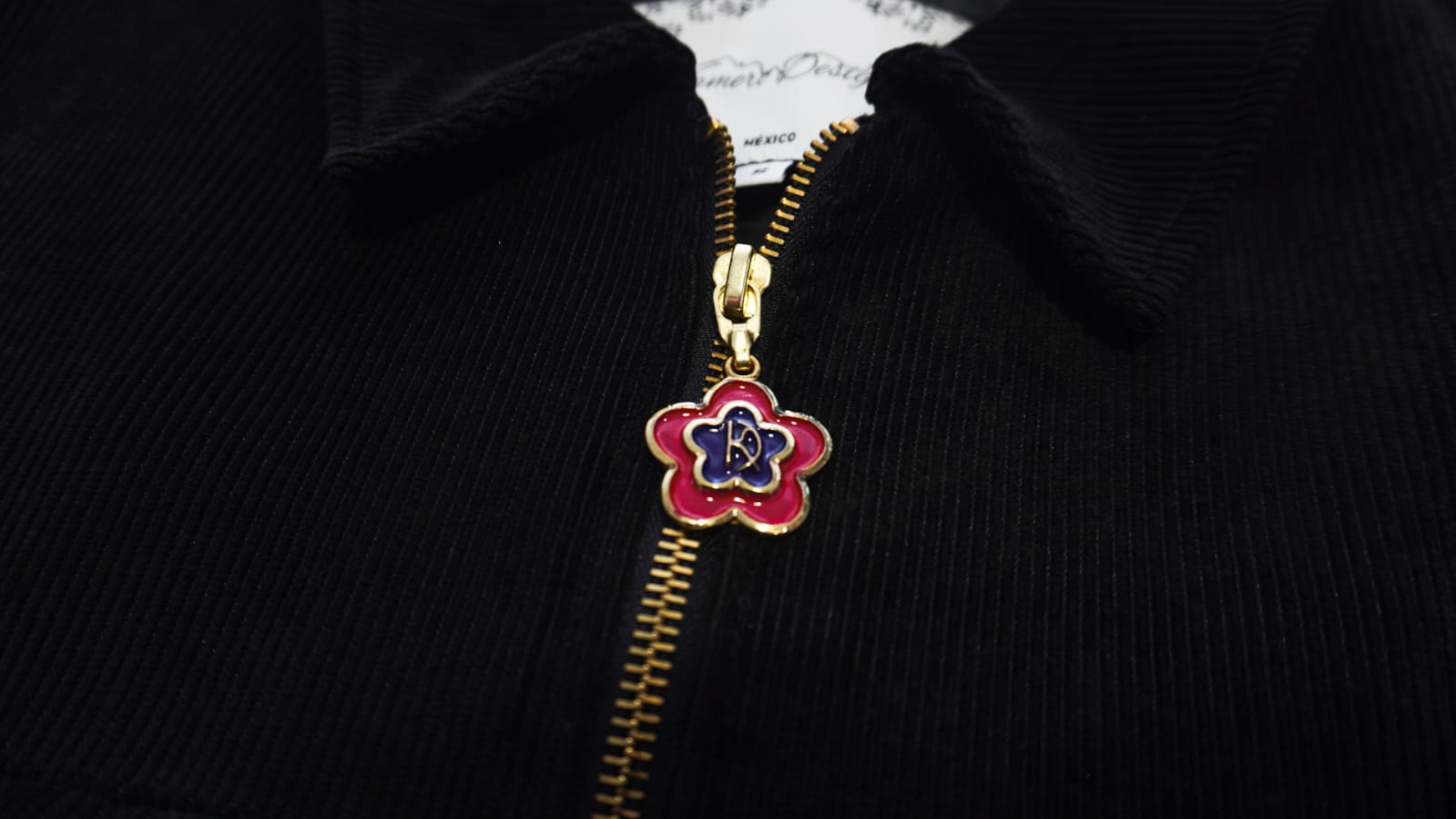 - Cremallera con jaladera de metal en forma del logotipo de la marca.